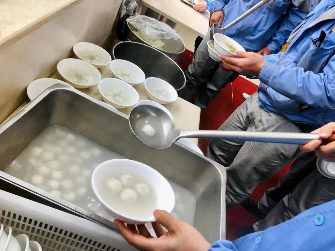 還未到飯點(diǎn),行政部工作人員早早的來到餐廳,整齊的擺好了小碗,細(xì)心的為每個(gè)碗里盛滿了湯圓。